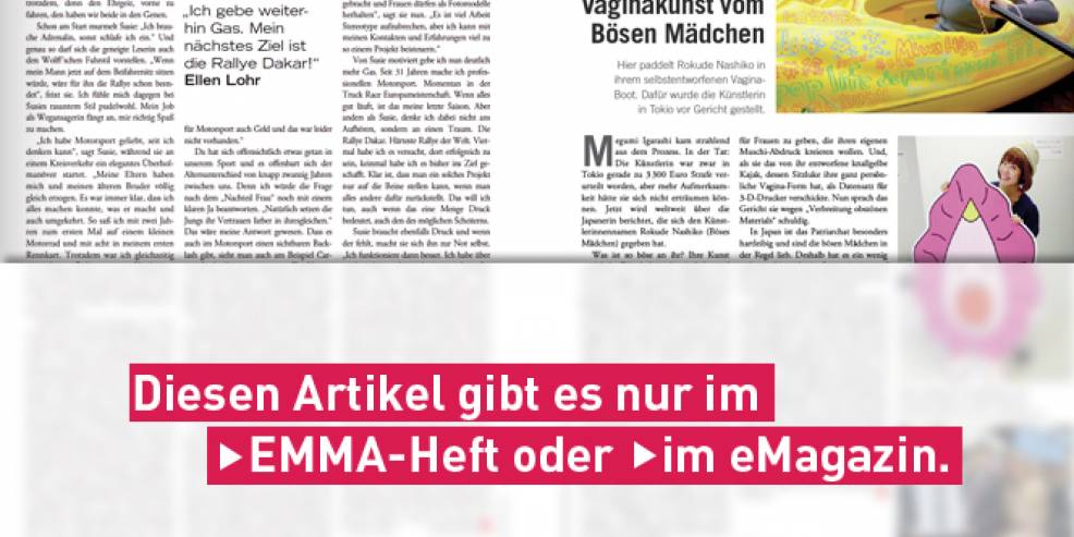 Frauen in Japan wüssten nichts über ihren eigenen Körper, klagt Megumi. Gleichzeitig aber seien Penisabbildungen weit verbreitet und selbstverständlicher Teil der Pop-Kultur. Sie hat darum auch eine Mangafigur kreiert: ein tropfenförmiges kleines Wesen, dessen Gesicht von wallenden, pinkfarbenen Schamlippen umgeben ist. Dieses Argument konnte die Richter nicht erschüttern. In Japan, wo die Porno-Industrie seit Jahrzehnten boomt, ist die Abbildung von Geschlechtsteilen verboten. Offiziell. Und darum, so die Richterin, seien Megumis Vagina-Objekte als „obszön“ einzustufen.