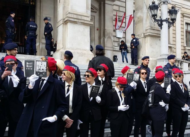 An diesem Tag kamen Burschenschafter, Mitglieder der rechtspopulistischen FPÖ und andere Rechte zum Akademikerball in der Wiener Hofburg zusammen. Sie tranken, tanzten Walzer, lauschten den Reden und bemerkten gar nicht, dass ein paar ihrer Gegnerinnen es in die Hofburg geschafft hatten. Am späten Abend entrollten dann zwei Damen im langen Abendkleid plötzlich am Tanzparkett ein Transparent mit der Aufschrift „Willkommen am Burschenschaft-Hysteria-Ball“.