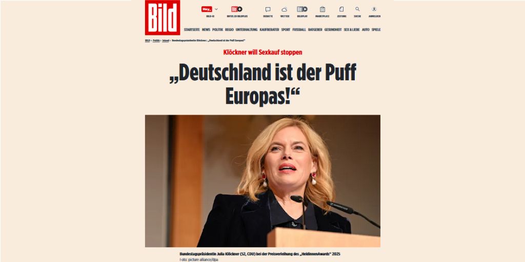 Kritik übt sie an Gewalt, Zwang und Machtgefälle. „Es bleibe bei gewaltigen Übergriffen, der Übermacht von Männern und bei der Unfreiwilligkeit.“ Das vernichtende Fazit der CDU-Politikerin: Deutschland sei der „Puff Europas“.