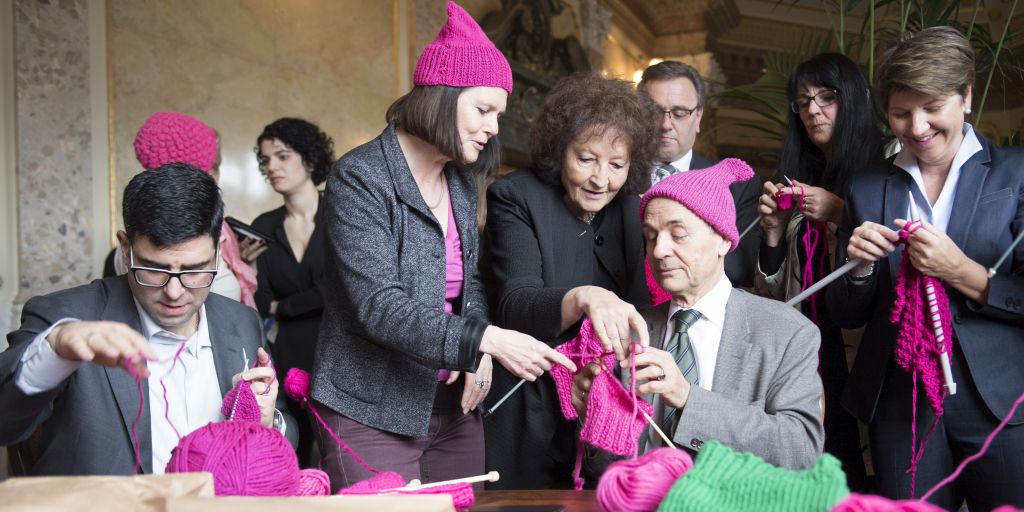 Das begriffen auch die Schweizer Frauenorganisationen, die daraufhin am Internationalen Frauentag zum „Strick-in“ vor dem Berner Parlament luden. Hunderte strickten ihre pinken Pussymützen vor dem Bundeshaus und forderten unter Nadelgeklapper Lohngleichheit und Kita-Plätze. Aber auch drinnen verdonnerten Politikerinnen ihre männlichen Kollegen zur Pussyhat-Produktion. Die Fotografen ließen sich das Bild der strickenden Nationalräte nicht entgehen, es erschien in quasi allen Schweizer Zeitungen.