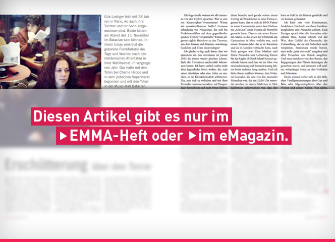 Gila Lustiger lebt seit 28 Jahren in Paris, wo auch ihre Tochter und ihr Sohn aufgewachsen sind. Beide hätten am Abend des 13. November im Bataclan sein können. In ihrem Essay umkreist die geborene Frankfurterin die Tage und Wochen nach den mörderischen Attentaten in ihrer Wahlheimat im vergangenen Jahr. Das hatte mit den Toten bei Charlie Hebdo und in dem jüdischen Supermarkt begonnen und mit den Toten in der Music-Hall Bataclan geendet. Lustiger schweift zurück bis zu den „Aufständen“ junger Muslime in den Vorstädten vor zehn Jahren. Schon damals hätte man ahnen können, was da auf uns zukommt – und vielleicht noch etwas tun können. Die Autorin betrachtet die TäterInnen mit ähnlicher Einfühlsamkeit wie die Opfer, doch lässt hier die Opfer noch einmal lebendig werden. Diesen Artikel in EMMA März/April 2016 lesen. Ausgabe bestellen