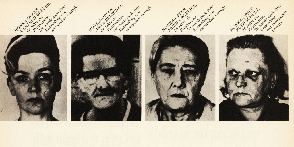 Das spektakuläre Honka-Urteil schließlich, sowie auch die Berichterstattung in der Presse, ist einer der Höhepunkte der Männer-Kumpanei. Es kommt einem Freibrief für Frauenmord gleich. Unvorstellbar, dass zum Beispiel Spiegel-Mauz über eine Mörderin, die vier Männer zerstückelt und eine Leiche auch noch sexuell verschandelt hat, so einfühlsam berichten würde... Wer stellt bei Täterinnen die Frage nach der fehlenden Liebe oder dem „Gespräch zwischen den Geschlechtern“? Ein Mann darf diese Ansprüche haben, eine Frau wird, wenn sie sie äußert, lästig – ein Grund mehr, sie zu beseitigen.