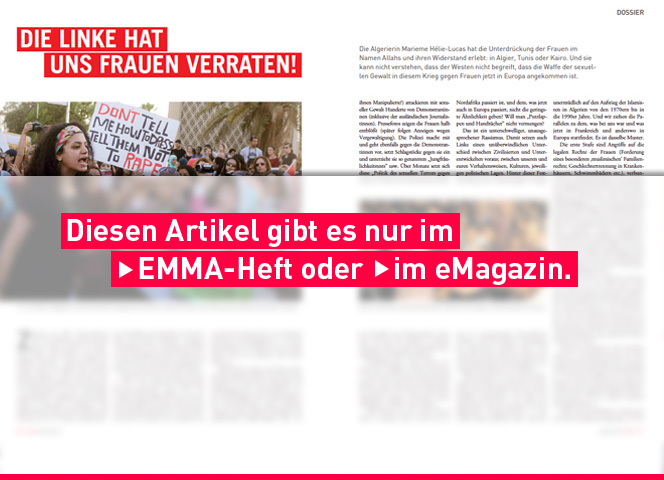 Die Algerierin Marieme Hélie-Lucas hat die Unterdrückung der Frauen im Namen Allahs und ihren Widerstand erlebt: in Algier, Tunis oder Kairo. Und sie kann nicht verstehen, dass der Westen nicht begreift, dass die Waffe der sexuellen Gewalt in diesem Krieg gegen Frauen jetzt in Europa angekommen ist - Diesen Artikel in der EMMA März/April 2016 lesen. Ausgabe bestellen