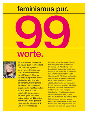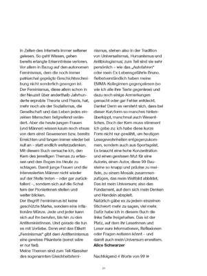 Schwarzer: „... jeder Kritik au eine unwürdige Art und Weise begegnet. Die wenigen Begegnungen, die wir hatten, fand ich immer recht sympathisch, aber Sie haben mich nie ernstgenommen. Warum sollten sie auch, ich bin ja auch die letzte, die Sie zwingen kann, mich ernstzunehmen in der Frauensache.“