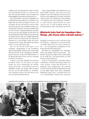 „Es ist nicht meine Haut“, sagt Augstein kühl, als es um Frauen geht, die versuchen, Kinder und Berufe zu verbinden. Aber es war vielleicht die Haut der einen oder anderen seiner Ehefrauen, vielleicht ist die eine oder andere an der Aufgabe gescheitert und hat entweder den Beruf und damit den Wunsch nach persönlicher Bestätigung und Bestätigung durch Befriedigung durch Leistung außerhalb des Hauses aufgegeben oder die Versorgung und Erziehung der Kinder anderen überlassen. „Eine Frau, die sich überwiegend um die Kinder kümmert, das ist nicht mein Fall, ob ich das will oder nicht, das ist nicht mein Fall.“
