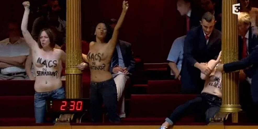 Die Pariser Femen waren skeptisch. Wie sich herausstellte, zu Recht. Nachdem die französische Nationalversammlung im November 2013 mit klarer Mehrheit für ein Prostitutionsgesetz inklusive Freierbestrafung gestimmt hatte, gab jetzt eine Sonderkomission des Senats vorab ein erstes Votum für den Senat ab. Es könnte knapp werden, wurde im Vorfeld gemunkelt. Deshalb traten die feministischen Guerilla-Girls auf den Plan: „Macs ou Senateurs?“ hatten sie sich auf die nackten Oberkörper geschrieben: „Zuhälter oder Senatoren?“