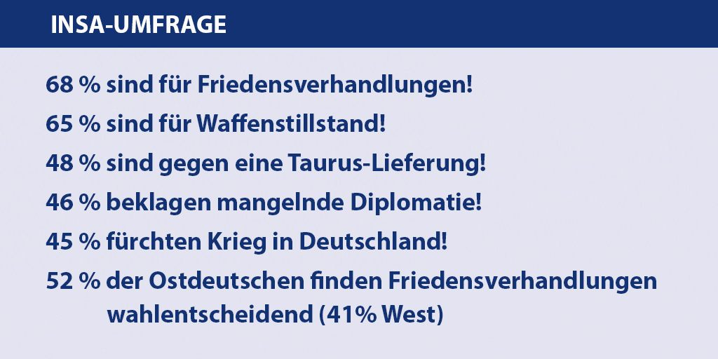 Auf die Frage „Sind Sie grundsätzlich für oder gegen Friedensverhandlungen mit Russland?“ antworteten 68 %: Ich bin dafür (Die Hälfte von ihnen ist „absolut“ für Friedensverhandlungen, die andere Hälfte „eher dafür“). In Ostdeutschland sind 76 % für Friedensverhandlungen, in Westdeutschland 66 %. Am stärksten für Verhandlungen sind die WählerInnen des BSW (87 %) und der AfD (82 %) – am wenigsten für Friedensverhandlungen sind die WählerInnen der Grünen (59 %) und der Linken (58 %).