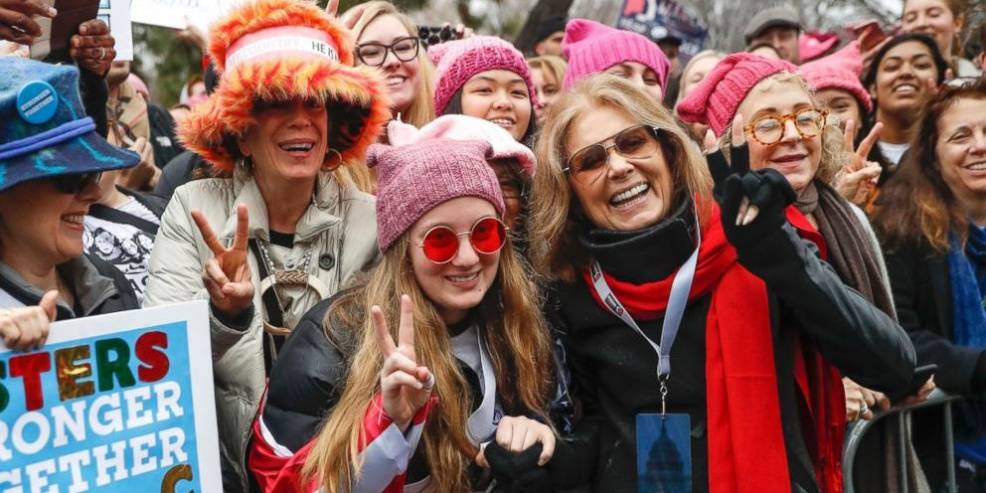 Als Gloria Steinem in einem Lederanzug und mit der gewohnten Porschebrille auf der Bühne ans Mikrofon tritt, bricht Jubel aus. Die 82-jährige Pionierin der Frauenbewegung und Gründerin des feministischen Ms. Magazine verweist auf die Errungenschaften der Frauenbewegung – und auf den erfolgreichen Kampf für das Recht auf Abtreibung der Polinnen im vergangenen Jahr. Ein Recht, für das Steinem schon als junge Frau auf die Straße gegangen ist. „Wir werden nicht zurückweichen!“ ruft die erfahrene Aktivistin den Massen zu. Ganz besonders begrüßt die erklärte Prostitutionsgegnerin Steinem „die Überlebenden der nationalen und globalen Sexindustrie“ auf dem Marsch. Und warnt Trump: „Wenn du die Muslime zwingst, sich registrieren zu lassen, werden wir uns alle als Muslime registrieren!“